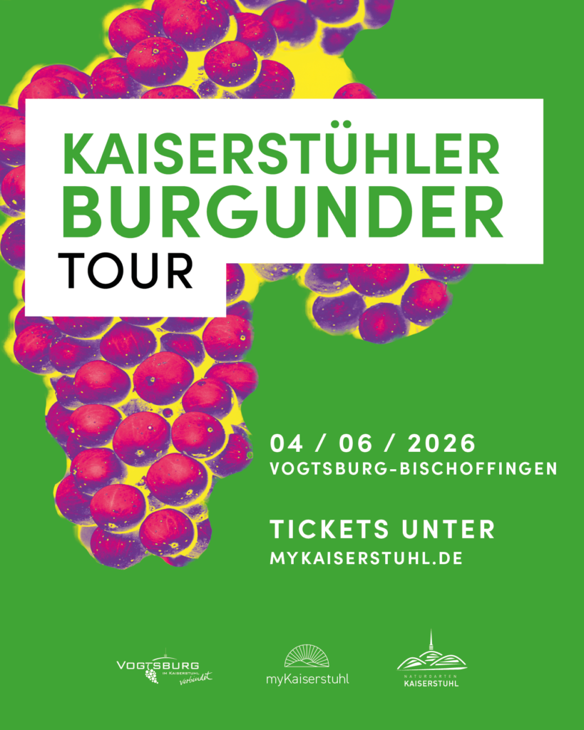Die heißbegehrte Kaiserstühler Burgundertour geht in die siebte Runde am 04. Juni 2026 (Feiertag – Fronleichnam). Auf circa 6 Kilometern erkunden wir die besten Weinlagen rund um das malerische Bischoffingen. An verschiedenen Stationen entlang der Route wartet die faszinierende Vielfalt der Vogtsburger Burgunderweine darauf, entdeckt zu werden. Über 25 Top-Weingüter, Winzergenossenschaften und Gastronomen aus Vogtsburg versprechen einen Tag voller kulinarischer Höhepunkte. Und als krönender Abschluss lassen wir die Afterparty bei den Bischoffinger Winzer in die Abendstunden übergehen.